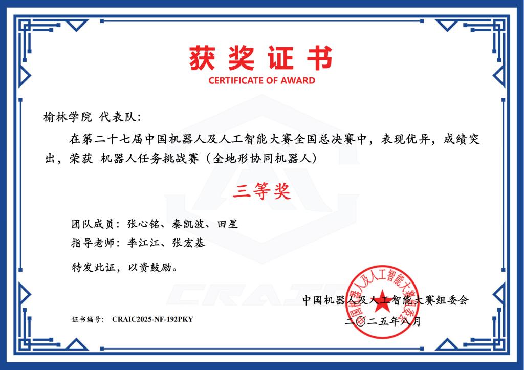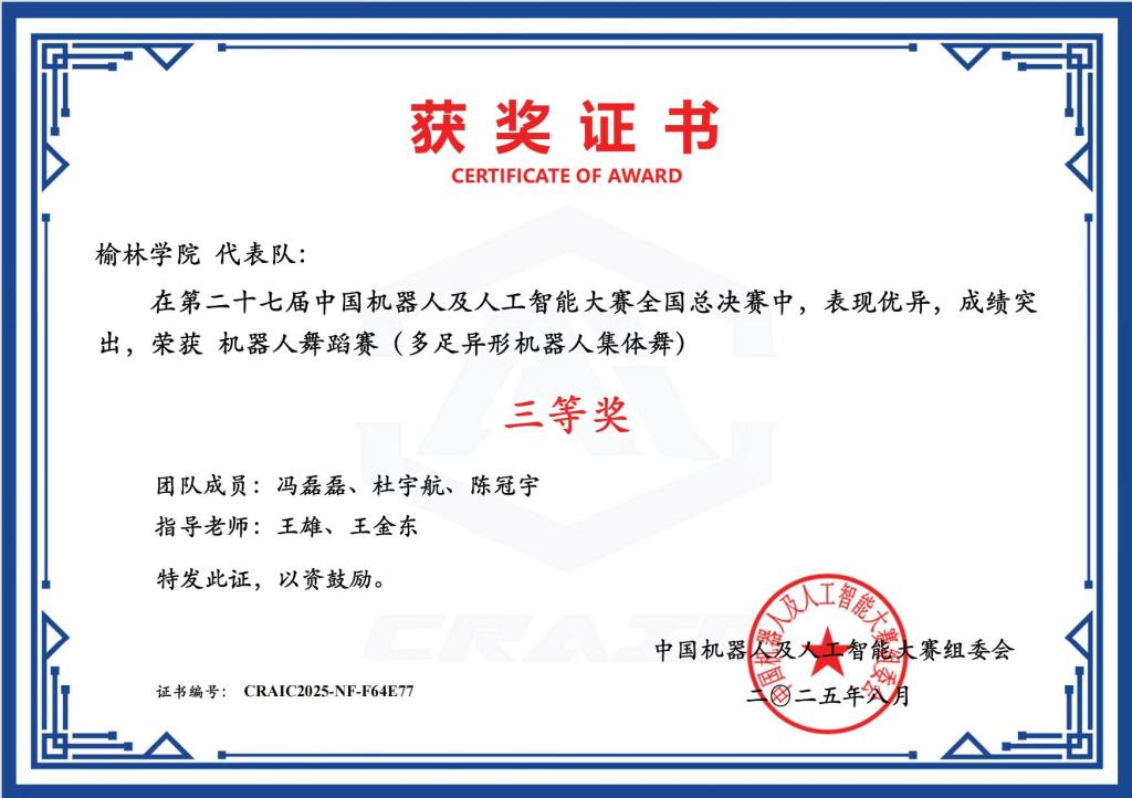 继在陕西省赛中突出重围后,我校三支代表队在全国总决赛中持续发力。由田文杰、罗萌萌、王子超组成的团队,凭借对智能文化创新创意赛的深刻理解与精湛技术,在众多作品中脱颖而出,荣获二等奖;冯磊磊、杜宇航、陈冠宇团队则以灵动的机器人舞蹈设计,在机器人舞蹈赛中斩获三等奖;张心铭、秦凯波、田星团队在全地形协同机器人挑战赛中,凭借对复杂地形的精准应对,同样收获三等奖。