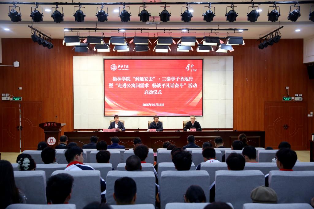张新柱在讲话中指出,“到延安去”·三秦学子圣地行和“走进公寓问需求•畅谈平凡话奋斗”活动是学校深入学习贯彻习近平新时代中国特色社会主义思想,特别是关于青年工作、关于教育的重要论述,落实立德树人根本任务的一项重要举措,也是学校赓续红色血脉、筑牢育人阵地、激励奋斗精神的一次生动实践,意义重大。他向与会师生提出三点希望:一是到延安去,汲取延安精神的伟大力量。延安是中国革命的摇篮,是中国共产党人的精神家园。通过“到延安去”的实践活动,引导广大师生深刻感悟和主动汲取延安精神的四种力量。一要从延安精神中汲取信仰力量,坚定对马克思主义的信仰、对社会主义和共产主义的信念,筑牢信仰之基、补足精神之钙、把稳思想之舵,始终保持政治定力;二要从延安精神中汲取思想力量,坚持解放思想、实事求是的思想路线,坚持一切从实际出发、理论联系实际,深入分析面临的机遇挑战,着力破解发展中的难题,不断推动各项事业取得新突破;三要从延安精神中汲取初心力量,深刻领会“全心全意为人民服务”的根本宗旨,落实立德树人根本任务,牢固树立以学生为中心的发展理念,解决学生急难愁盼问题,不断增强学生的获得感、幸福感、安全感;四要从延安精神中汲取奋斗力量,发扬自力更生、艰苦奋斗的创业精神,以一往无前的奋斗姿态和永不懈怠的精神状态,为学校高质量发展作出更大的贡献。二是读《平凡的世界》,跟着路遥去奋斗。路遥是陕北黄土地的优秀儿子,他的代表作《平凡的世界》感动了无数读者,激励了一代又一代青年。我们要学习路遥,践行四个奋斗。一要艰苦奋斗,在苦难中领悟人生真谛,在逆境中磨砺意志,在拼搏中开拓人生,不惧艰难险阻,勇往直前,在平凡的岗位上创造不平凡的业绩;二要主动奋斗,在平凡中追求卓越,在主动中开创新局,主动将个人发展融入时代洪流和国家需要,在服务奉献中实现人生价值;三要激情奋斗,路遥本人用生命写作,其作品中的人物也对生活充满热爱与激情。这种“热泪盈眶”的激情,是干事创业的“催化剂”;四要持续奋斗,路遥创作《平凡的世界》用了整整六年时间,这种“咬定青山不放松”的执着精神令人敬佩。奋斗并非一朝一夕之事,只有长期坚持和不懈努力,才能最终实现自己的人生理想。三是全面建强一流应用型大学,培养胸怀天下身怀良技心怀情趣的一流应用型人才。汲取精神力量,标定奋斗范式,最终要落脚于办学实践。一要构建“三角形”育人体系,培养一流应用型人才。根据国家战略和榆林产业需求调整专业,建立“专业+人工智能+五乐育人”的人才培养体系,促进学生全面发展,提高人才培养质量;二要深化“思政四部曲”,扣好人生第一粒扣子。通过参观百年校史馆、观看原创红色话剧《李子洲在1929》、阅读文学经典《平凡的世界》和聆听劳模故事,教育引导学生坚定理想信念、树立远大志向,奋力跑出当代青年的最好成绩;三要践行五乐育人,做全面发展的时代新人。不断深化“五乐育人”工程(乐讲铸魂、乐读启智、乐跑强体、乐唱育美、乐劳塑品),锻造胸怀天下身怀良技心怀情趣的真本领,培养既有坚定理想信念、又有扎实能力本领,既敢于担当作为、又富有生活情趣的德智体美劳全面发展的新时代栋梁之才;四要实施新“六个一”战略举措,全面建强一流应用型大学。深入实施“一个遵循、一个根本、一个战略、一个战术、一个关键、一个保障”新“六个一”战略举措,坚持有所为有所不为,从平原迈向高原,全面建强一流应用型大学,保障学生在未来的人生道路上走得快、走得稳、走得顺、走得好。