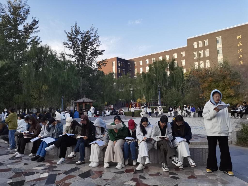 除焕新升级的英语角外,每周一至周五常态化开展的特色晨读,更是“乐读”理念落地的重要载体。晨读并非简单的内容叠加,而是对“沉浸式语言课堂”的延伸——通过固定时段(7:00—7:30)、专属场地(乐讲广场),为学生营造专注的语言学习氛围,使“乐读”从理念转化为每日可感、可践的学习体验。外国语学院冯宏图老师介绍,学院在2025级新生军训结束后,每日组织新生齐聚乐讲广场,于晨光中书声朗朗,积累词汇、锤炼语音,在诵读与互动中提升语感与表达能力。他认为,晨读不仅助力学生养成早起自律的习惯、营造积极学风,更通过与英语演讲、配音、学科竞赛等活动的联动,将语言学习深度融入校园文化,发挥示范引领之效。