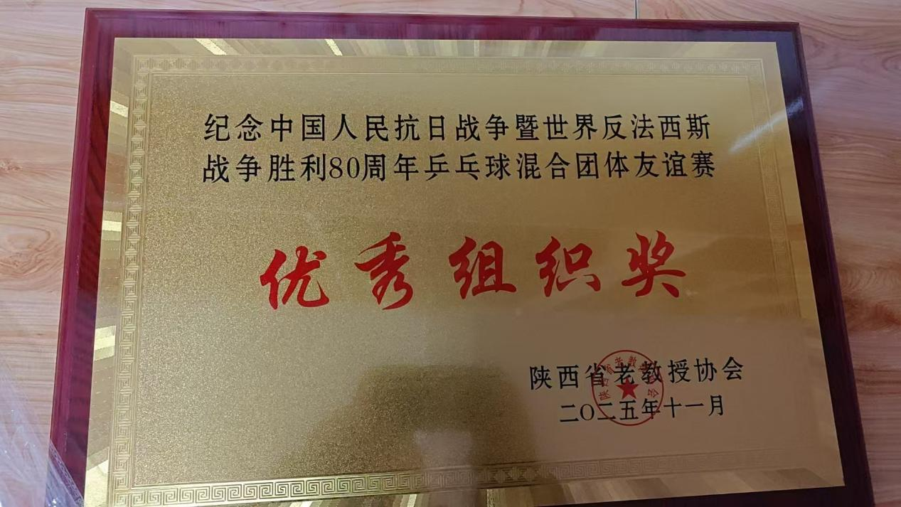 11月1日,由陕西省老教授协会主办的“纪念中国人民抗日战争暨世界反法西斯战争胜利80周年乒乓球混合团体友谊赛”在西北工业大学圆满落幕。我校离退休乒乓球代表队团结拼搏、表现出色,荣获“优秀奖”与“优秀组织奖”两项荣誉。
