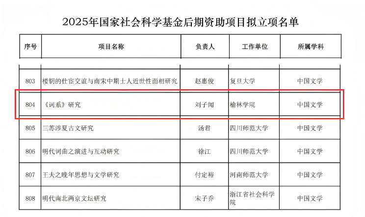 近日,全国哲学社会科学工作办公室公示了2025年度国家社会科学基金后期资助暨优秀博士学位论文出版、优秀学术著作再版项目立项名单,我校刘子闻博士申报的《<词系>研究》(中国文学学科)成功获批后期资助项目。这是我校在人文社科研究领域取得的又一项突破,是学校高度重视哲学社会科学研究、持续加强科研队伍建设、优化科研管理服务的结果。