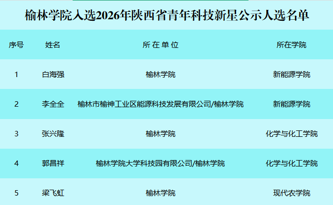 日前,陕西省科技厅公布了2026年陕西省青年科技新星人选。我校新能源学院白海强博士、李全全博士,化学与化工学院张兴隆博士、郭昌祥博士,现代农学院梁飞虹博士入选2026年陕西省青年科技新星,入选数量位居省属高校前列。