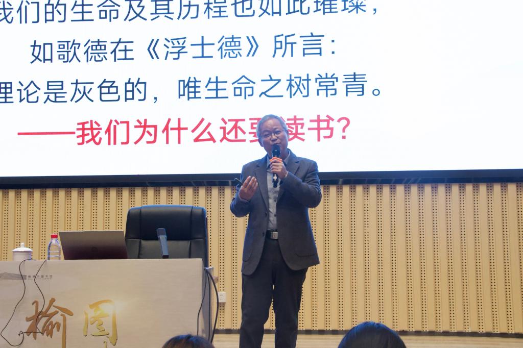 讲座中,鲍鹏山教授从当代人面临的精神处境出发,深刻指出在碎片化、功利化阅读盛行的今天,重新追问“为何读书”具有根本性意义。他系统阐述了自己归纳的“读书的三个理由”,其论述引经据典、层层递进。其一读书是为了认识世界。因为书籍尤其是经典承载着关于历史规律、社会结构与人性奥秘的“本质的世界”,能帮助我们构建整体性的认知框架;其二读书是为了改造世界。阅读从来不止于“知”,更落脚于“行”。经典作品中往往蕴含着对更美好社会、更公平秩序的向往与描绘,这些“理想的世界”为我们提供了批判现实的镜鉴与变革未来的蓝图;其三读书是为了完善自己。书中凝结的“理想的人格”典范,让我们在与先贤的精神对话中完成自我教育与人格塑造,在对照与反思中校准人生方向,最终迈向心灵的丰盈与生命的完整。