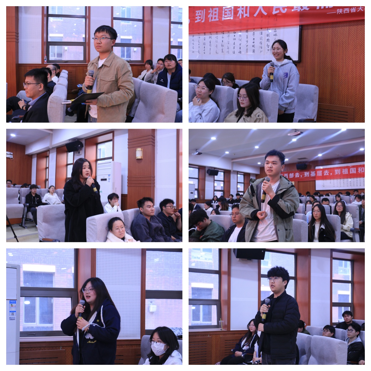 事迹分享环节,西安交通大学研究生支教团宋思仪赴柞水县支教,将当地木耳产业与西迁精神融入思政课堂,以课堂为炬点亮学子梦想,生动诠释 了“支教是一场双向奔赴的成长”;延安西部计划项目专员任盼欣扎根革命老区,全力推动“青年之家”县域全覆盖,俯身倾听民声、躬身务实服务,深刻践行 “基层是最好的课堂”;周至县骆峪镇西部计划志愿者孙思思驻守乡村一线,深耕田间地头助力猕猴桃产业发展,以实干笃行兑现“青春赴西部之约”的铮铮承诺。三位西部计划优秀志愿者结合亲身经历讲述扎根基层、奉献西部的青春故事,以真实案例传递榜样力量,其真挚朴实的分享直抵人心,深深打动全场师生。