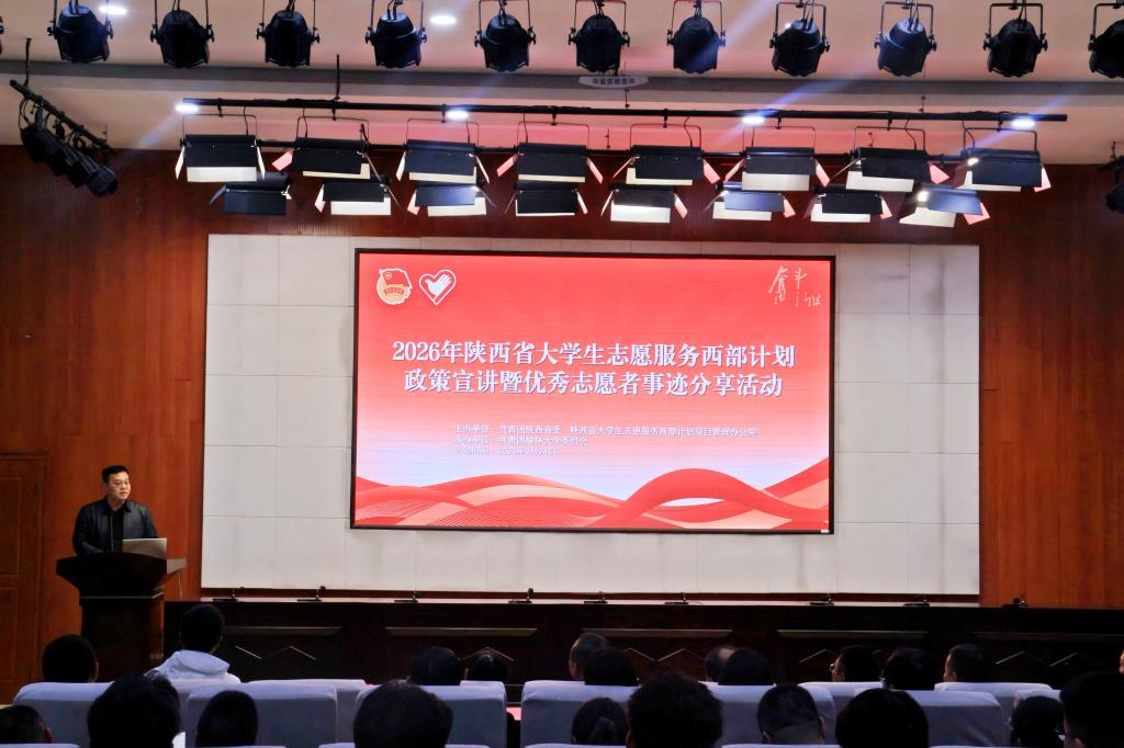 3月24日,2026年陕西省大学生志愿服务西部计划政策宣讲暨优秀志愿者事迹分享活动在我校逸夫楼报告厅举行。我校副校长卜耀军致辞,团省委青社部主任李林、团市委副书记李登东莅临指导;陕西省西部计划宣讲团成员,我校招就处、研究生院、团委、各二级学院党总支副书记、团总支书记、就业专干及应届本硕毕业生代表参会。